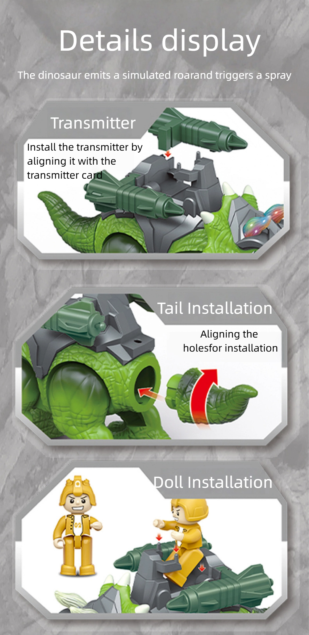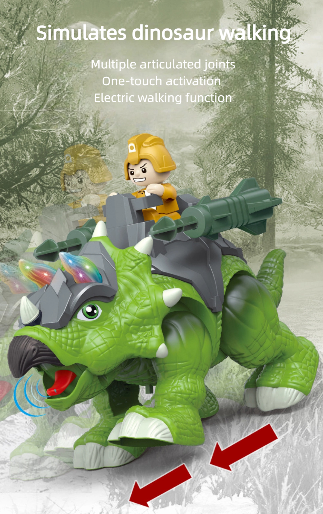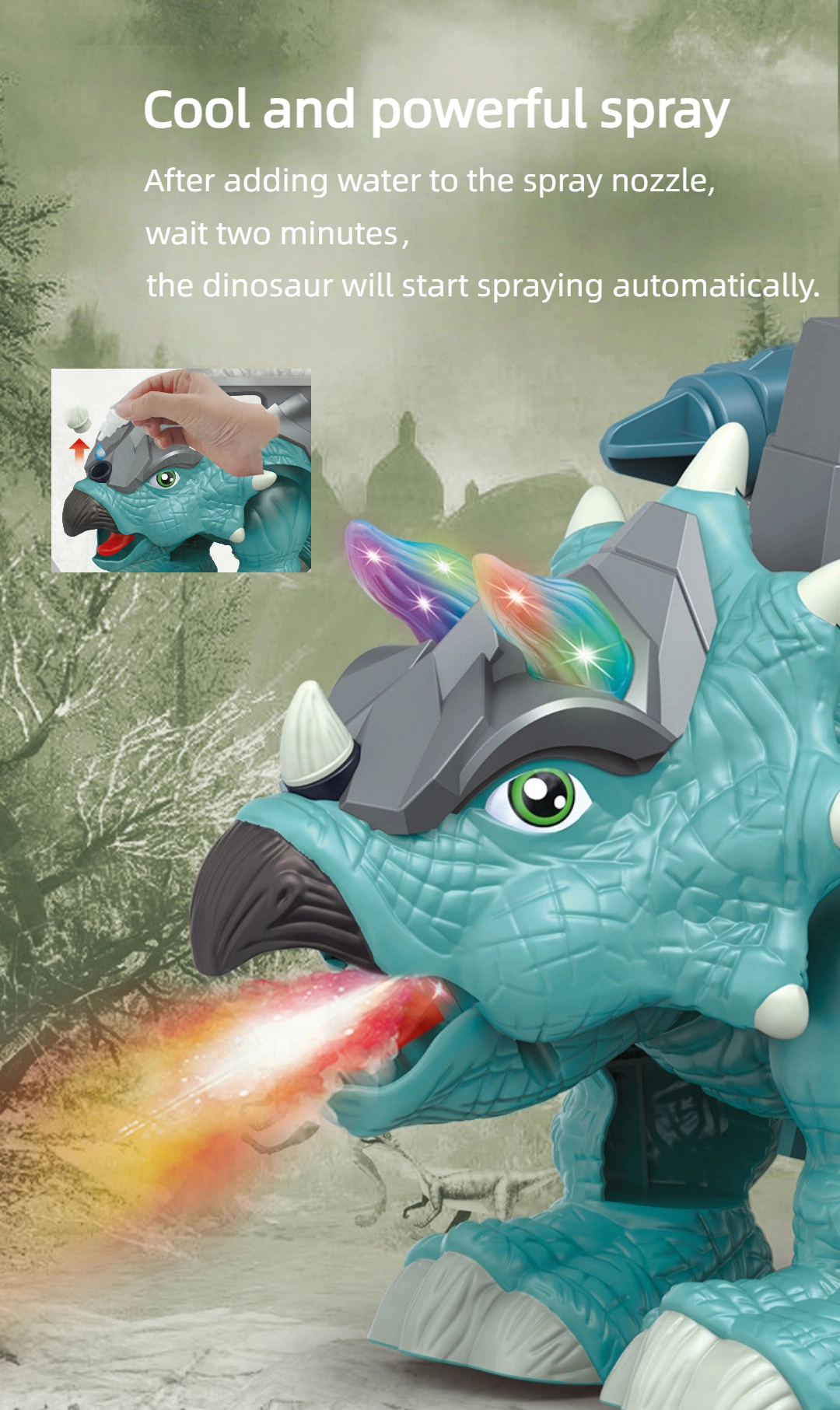 This electric spray Triceratops model toy combines ambient lighting, bionic walking, dinosaur sound effects, electric spray, and missile launching. It can simultaneously train children's emotions, vision, intelligence, hand-eye coordination and other multiple abilities during parent-child interaction. The cool appearance and interesting battle gameplay make early education more immersive.
